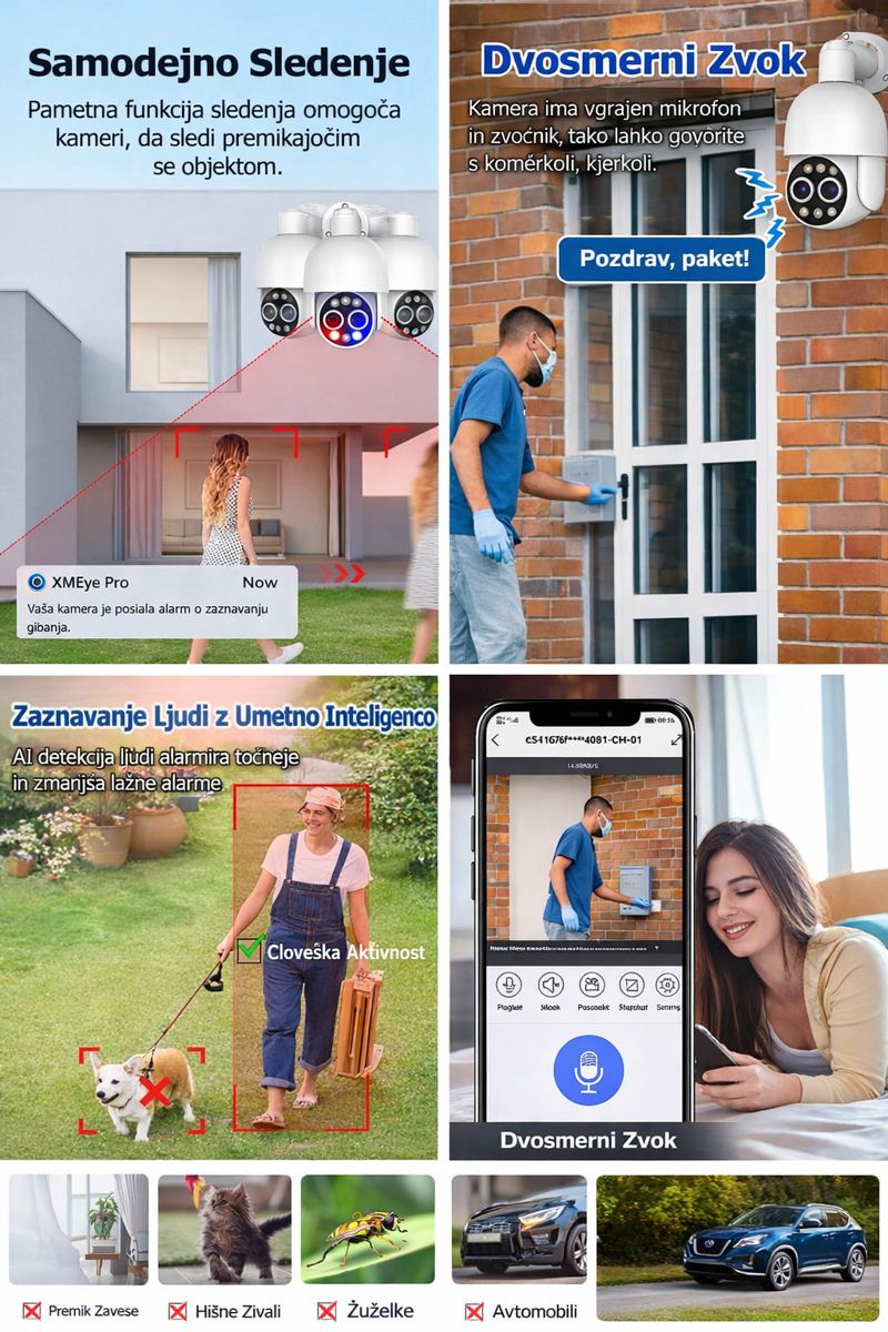 🔄 PTZ funkcija – panoramska rotacija 355° / nagib 90° + auto tracking